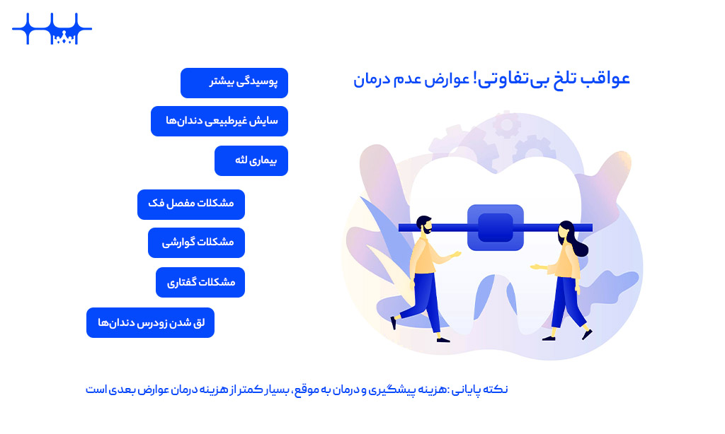 می توان گفت افرادی که به هر دلیل از درمان ارتودنسی دندان سر باز می زنند، بعدها دچار مشکلات فراوانی می شوند. در این بخش قصد داریم شما را با عوارض احتمالی عدم درمان مشکلات دندان و فک آشنا کنیم. اطلاع از این مشکلات شاید اهمیت و ضرورت این درمان را برای شما روشن سازد.