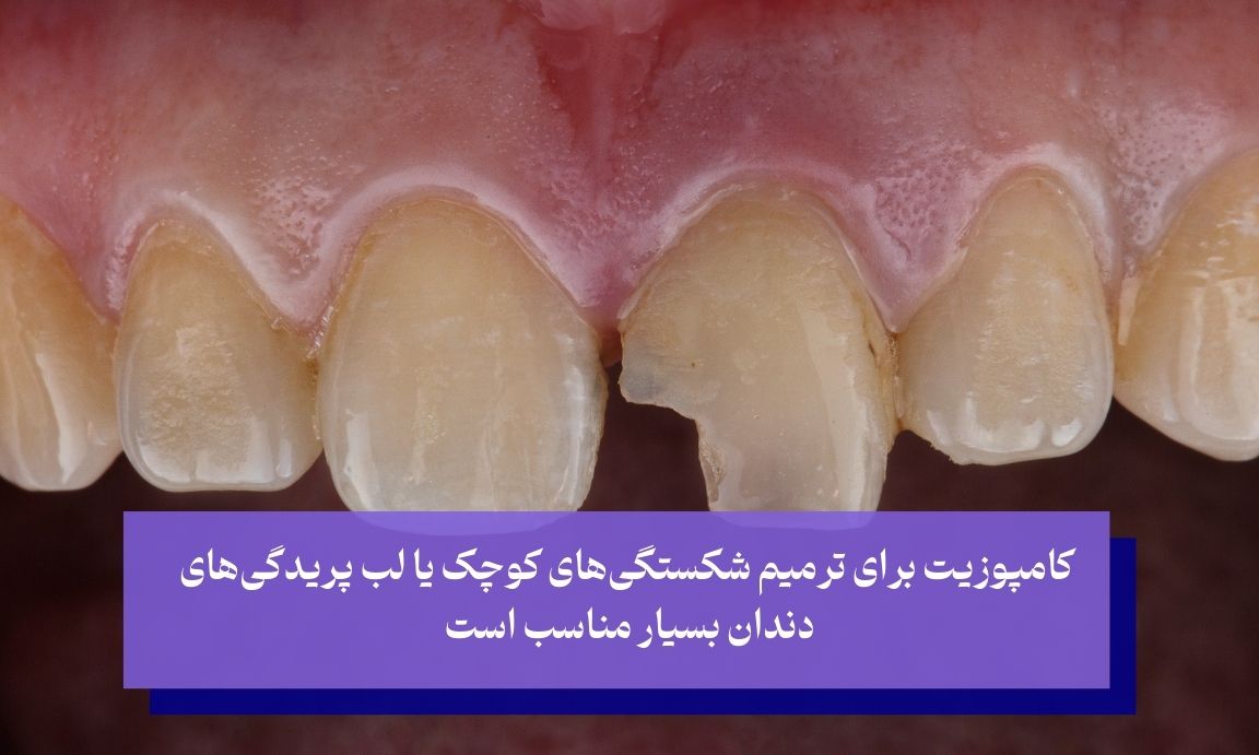 - ترمیم شکستگی یا لب پریدگی دندان: کامپوزیت برای ترمیم شکستگیهای کوچک یا لب پریدگیهای دندان بسیار مناسب است.